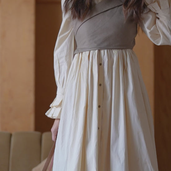 Designed for cozy sophistication, this cotton winter dress is paired with a chic brown tie-back vest for a stylish layered look. The breathable yet warm winter cotton fabric ensures comfort during cooler days, while the tie-back detail on the vest adds structure and creates a flattering silhouette. In earthy tones of off-white and brown, this versatile ensemble is perfect for casual outings, seasonal gatherings, or styled with boots and accessories for a polished winter look.