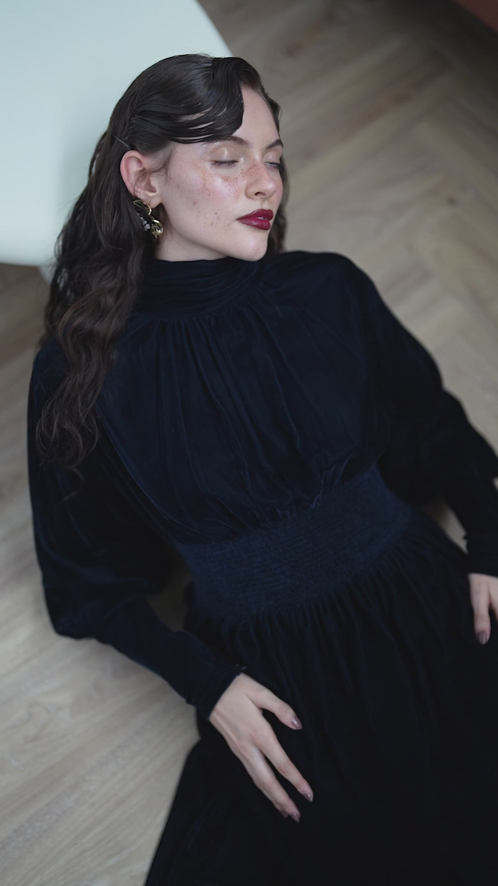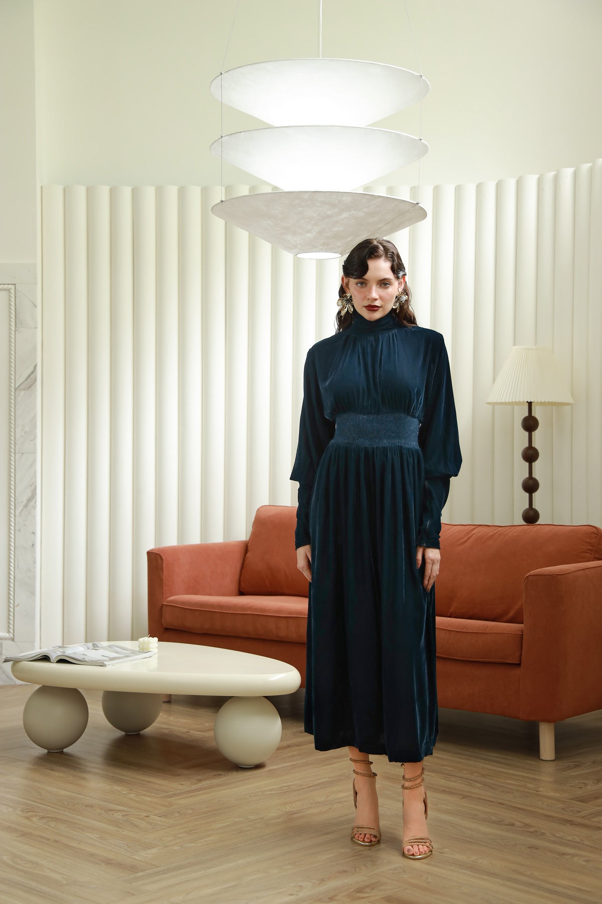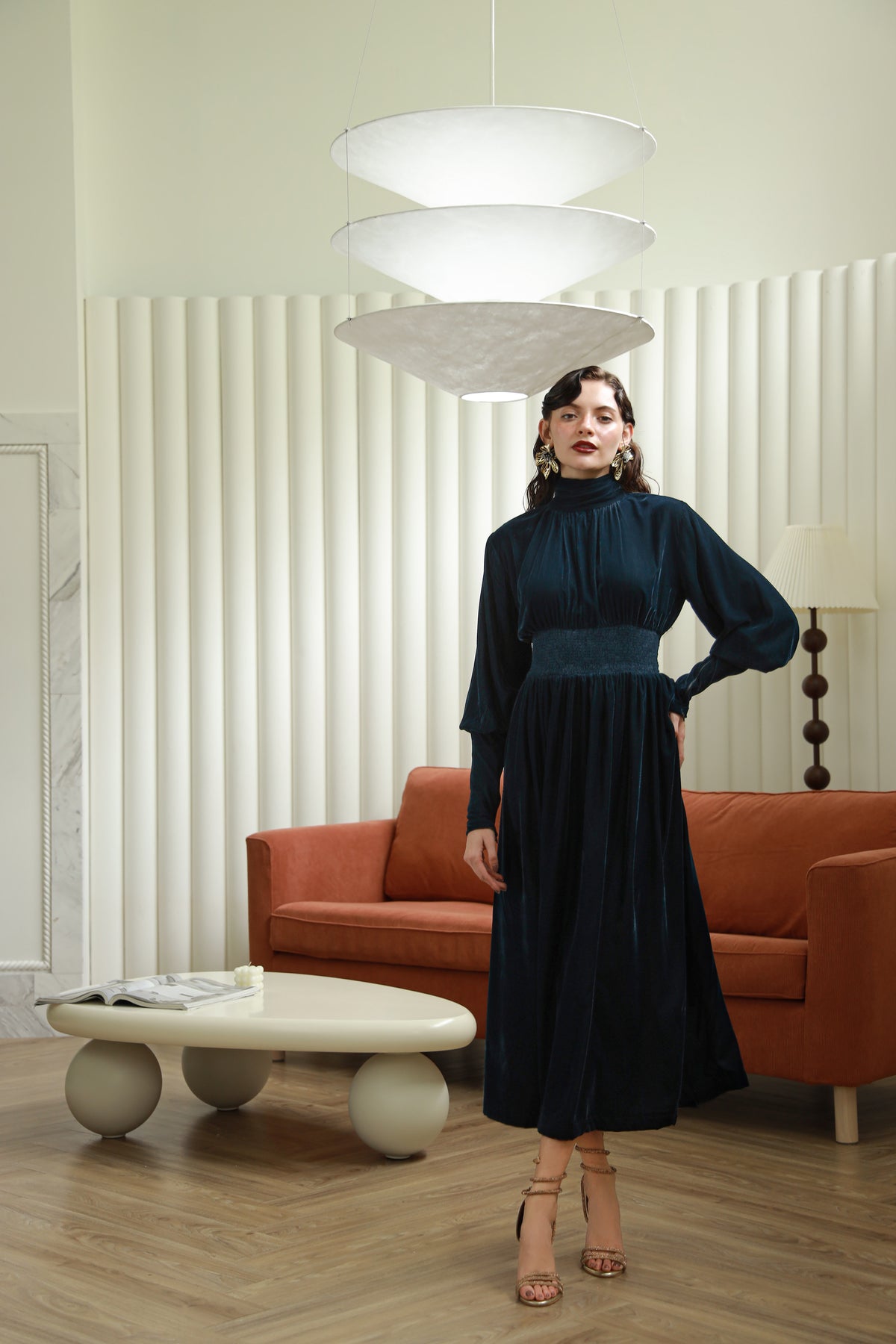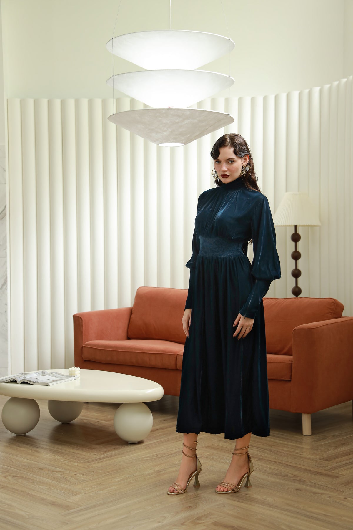 The Emerald Embrace Dress is crafted from deep zinc velvet that radiates elegance and depth. With its plush texture and graceful silhouette, this dress makes a sophisticated statement—perfect for special occasions, evening gatherings, or formal celebrations where timeless style and refined charm are essential.