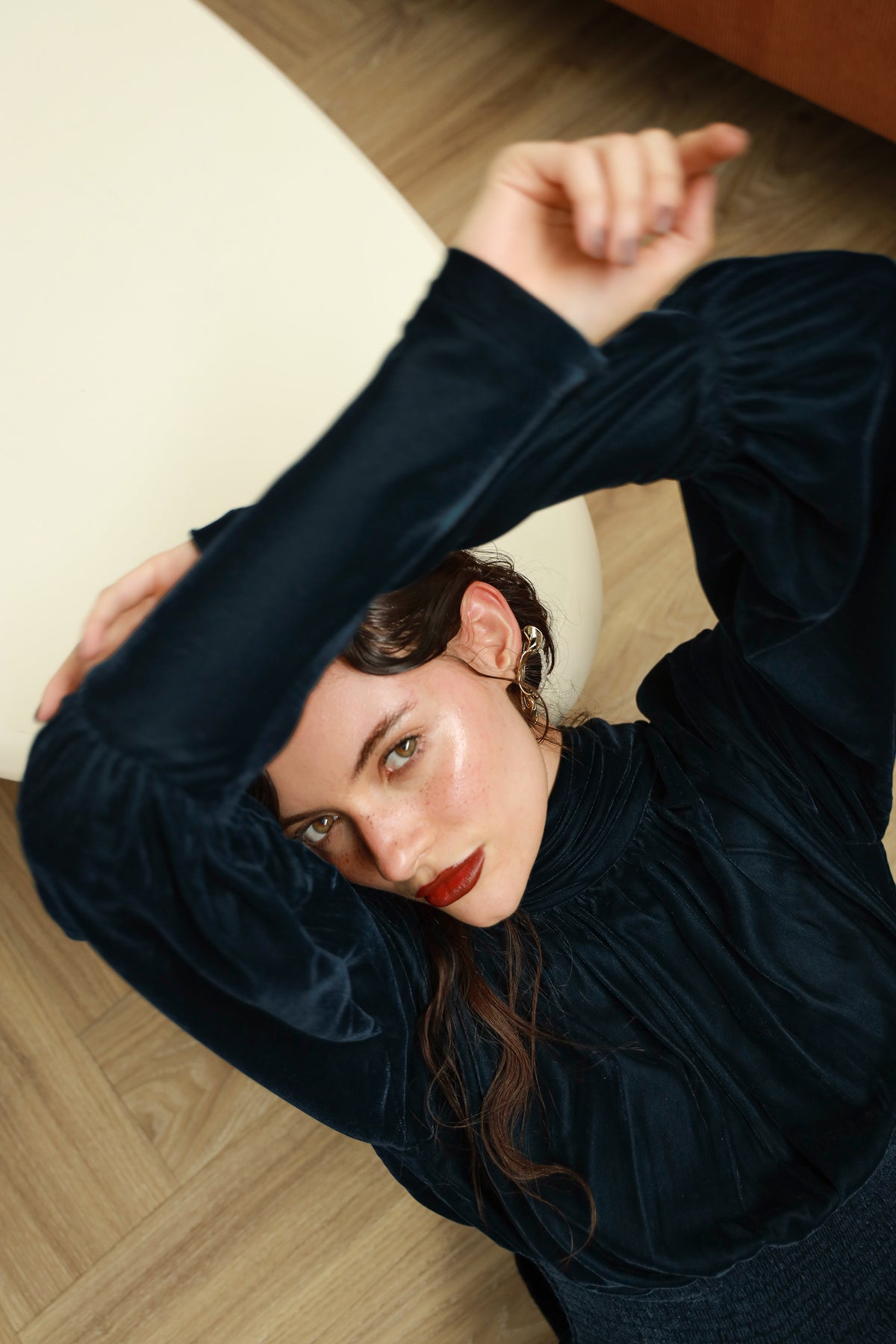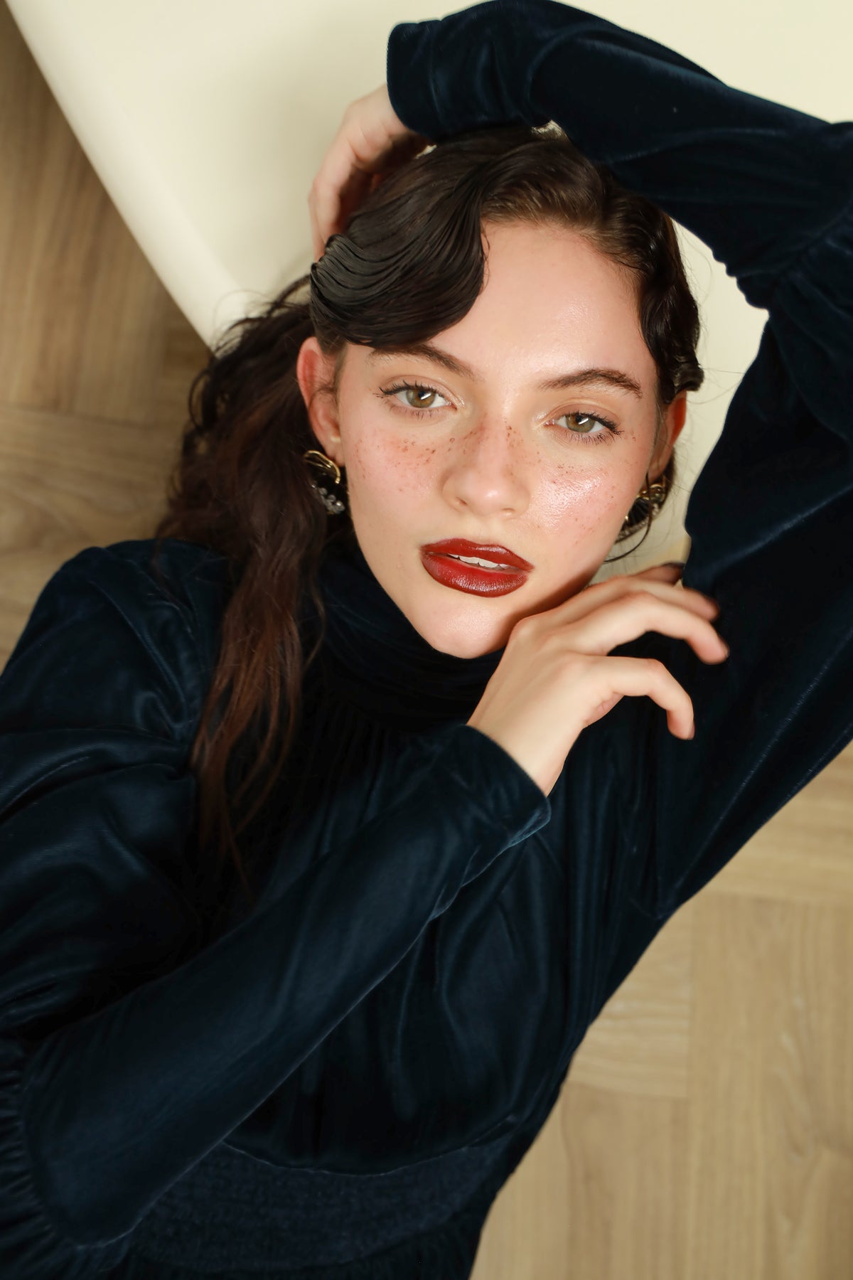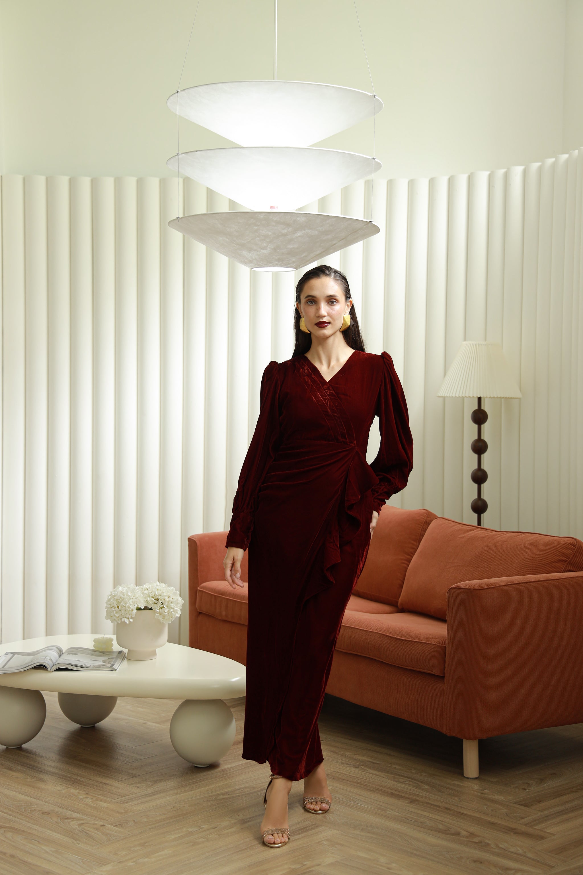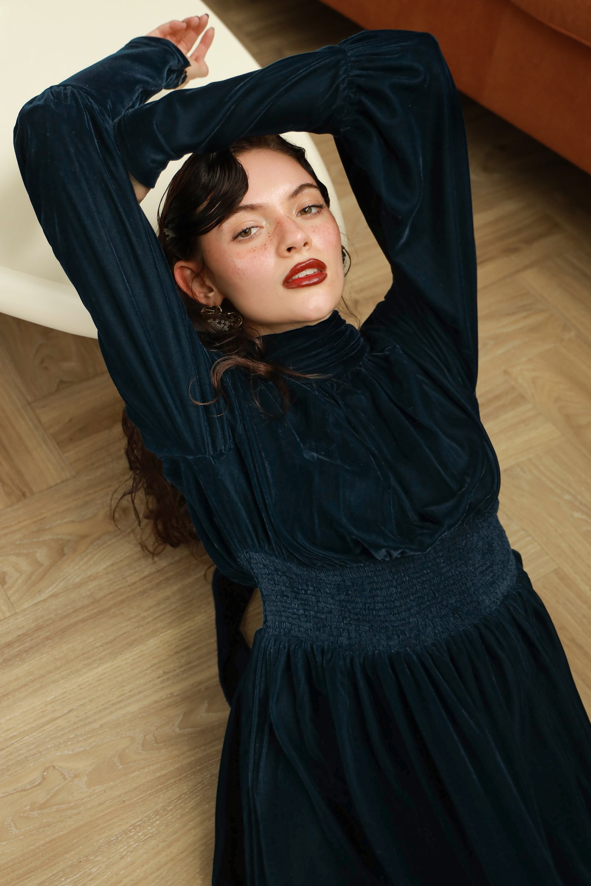 The Emerald Embrace Dress is crafted from deep zinc velvet that radiates elegance and depth. With its plush texture and graceful silhouette, this dress makes a sophisticated statement—perfect for special occasions, evening gatherings, or formal celebrations where timeless style and refined charm are essential.