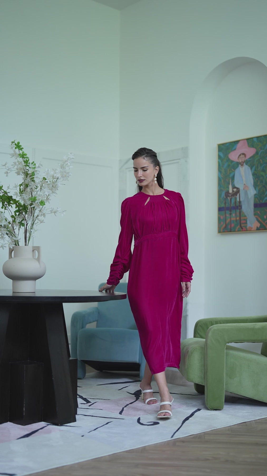 The Opulent Touch Dress is crafted from vibrant hot pink velvet that exudes bold sophistication. With its plush texture and striking color, this dress is a true statement piece, perfect for elegant evenings, formal events, or special occasions. Designed to embody a captivating blend of luxury and confidence, it elevates your wardrobe with timeless charm and modern allure.
