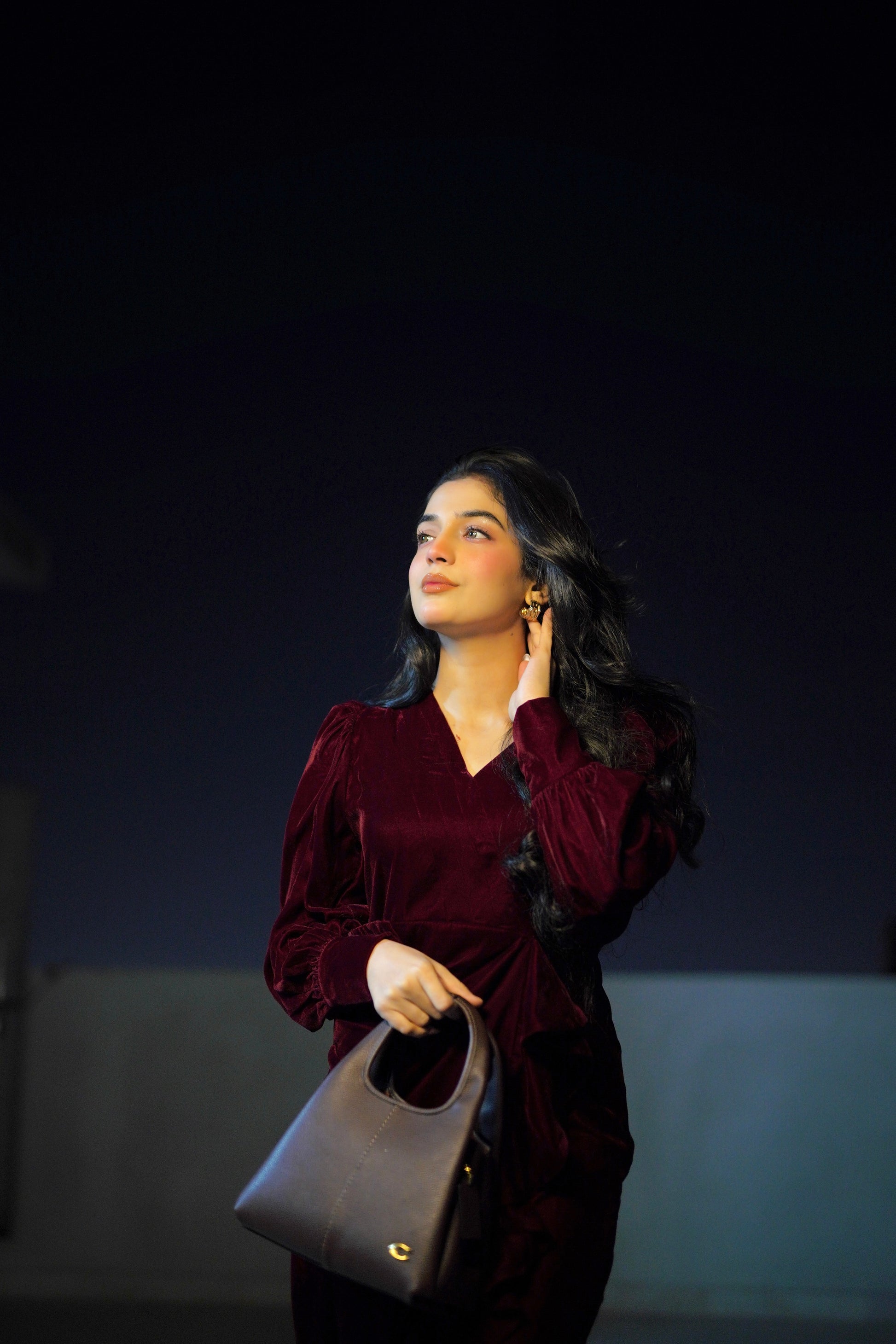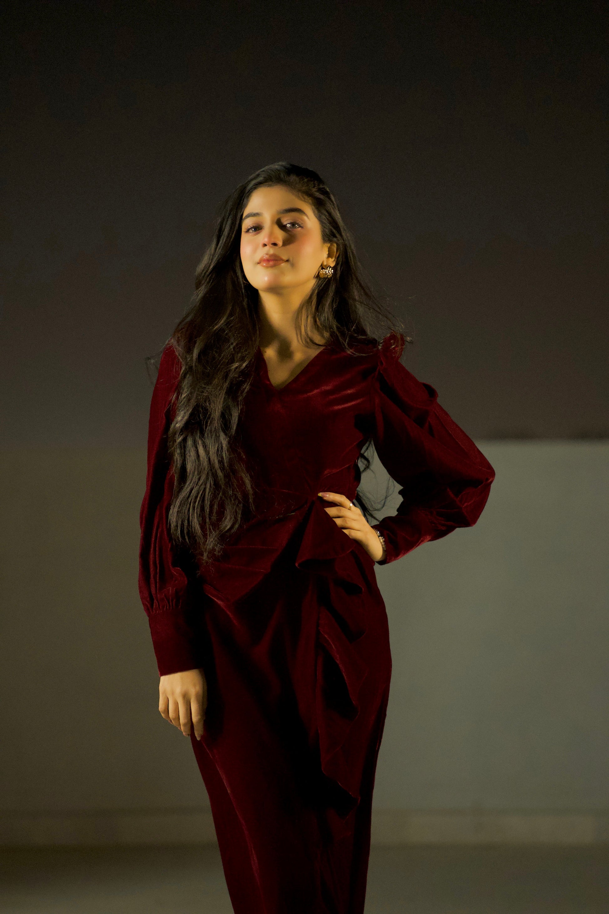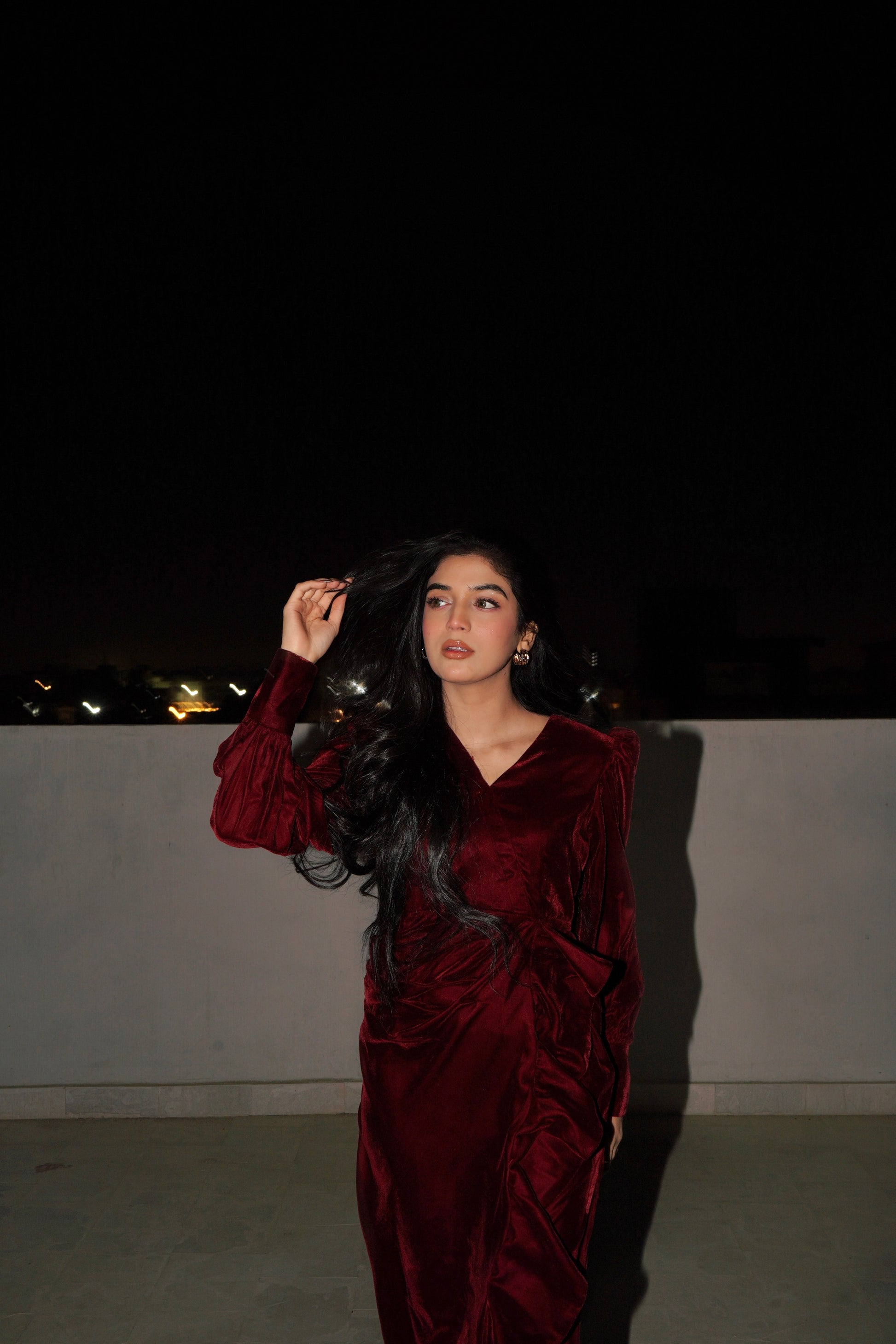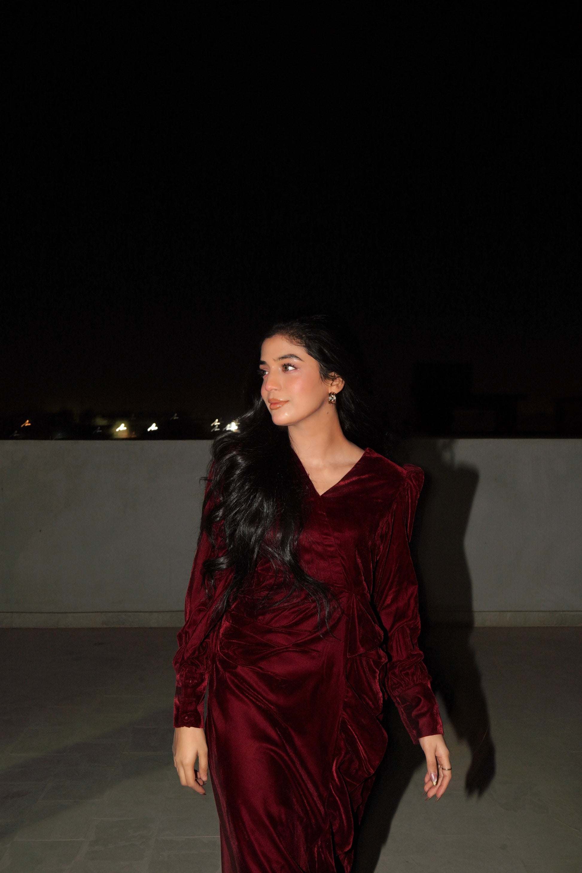 The Twilight Veil Dress is crafted from deep maroon velvet, radiating elegance and depth. With its rich, plush fabric and graceful design, this dress makes a sophisticated statement, perfect for special occasions, evening gatherings, or formal events where timeless style and refined charm are essential.