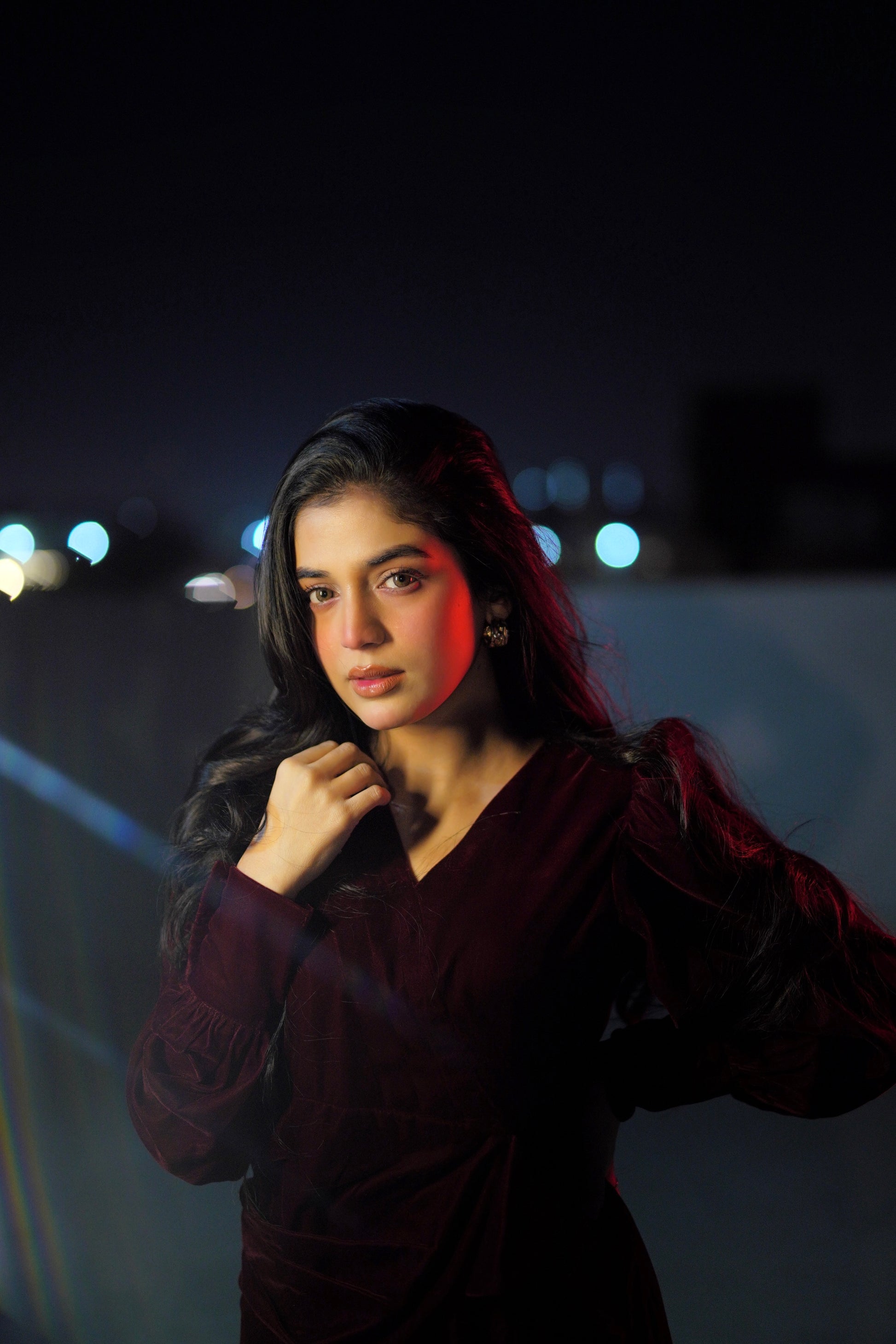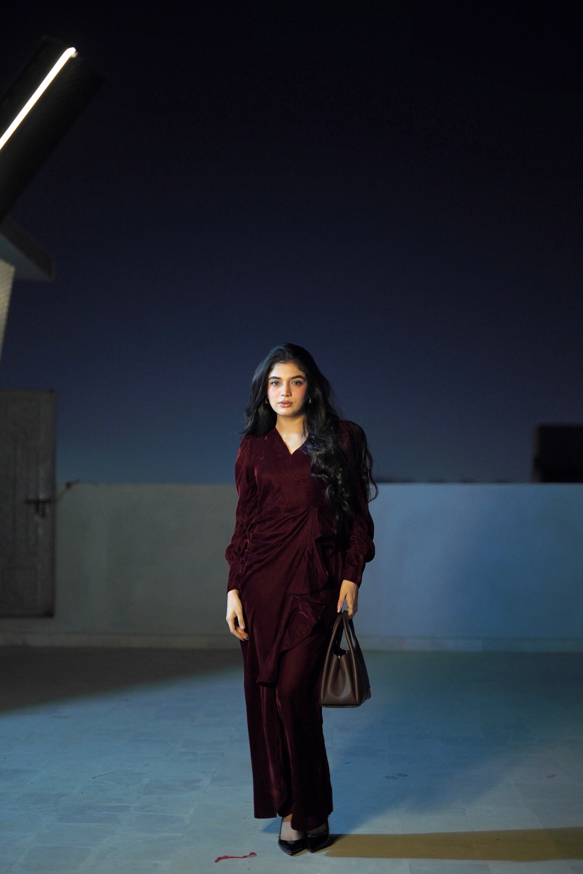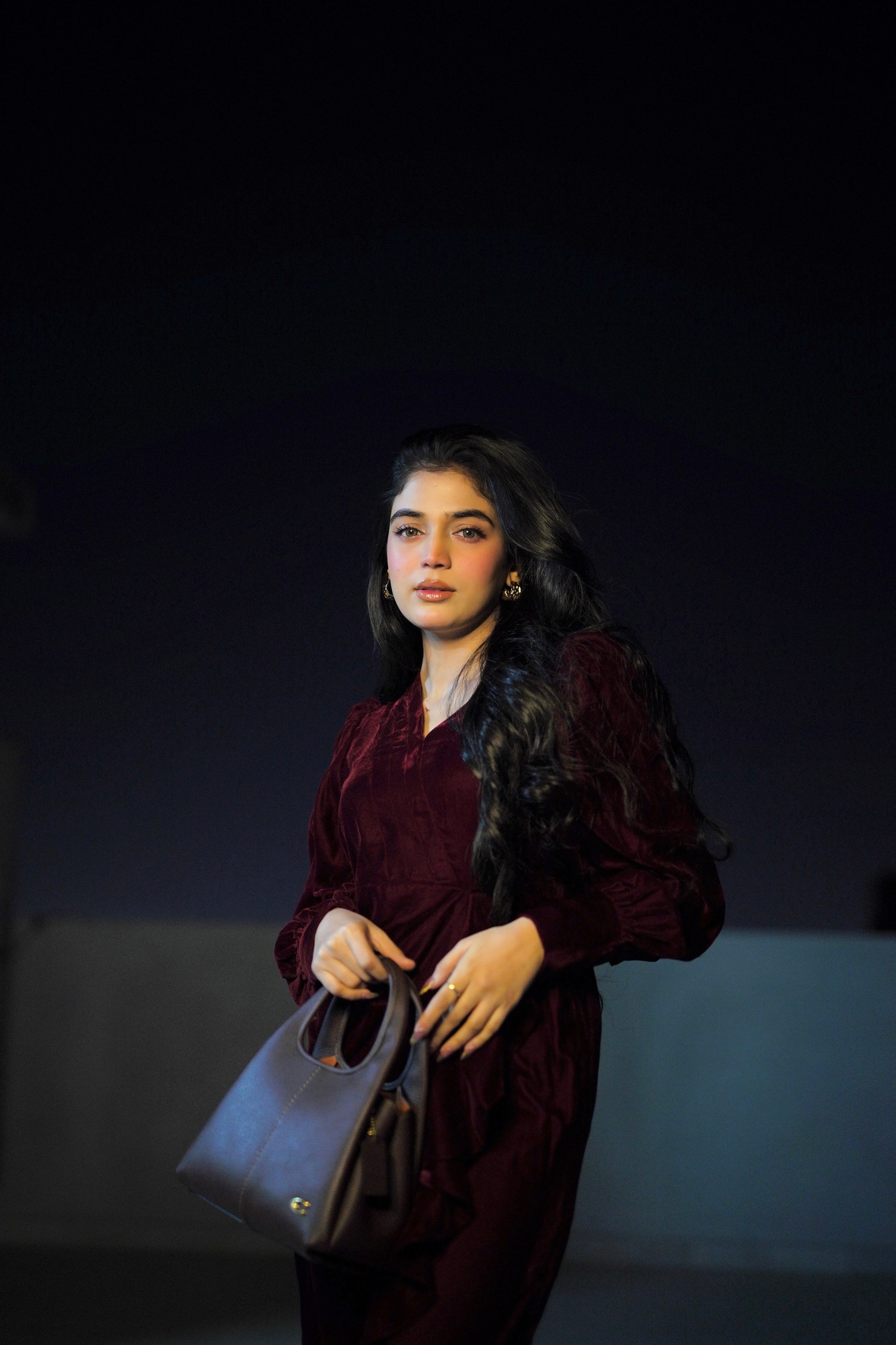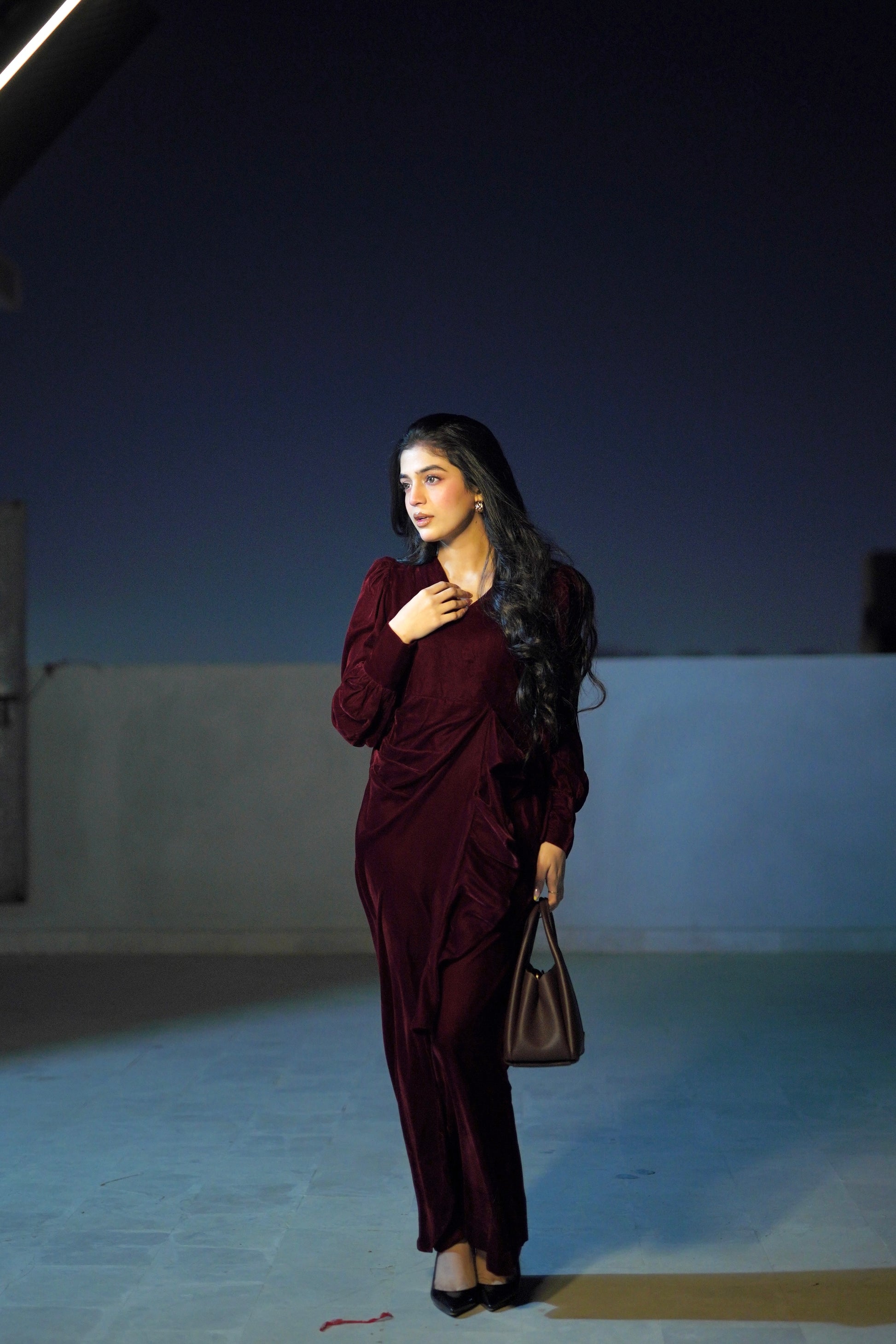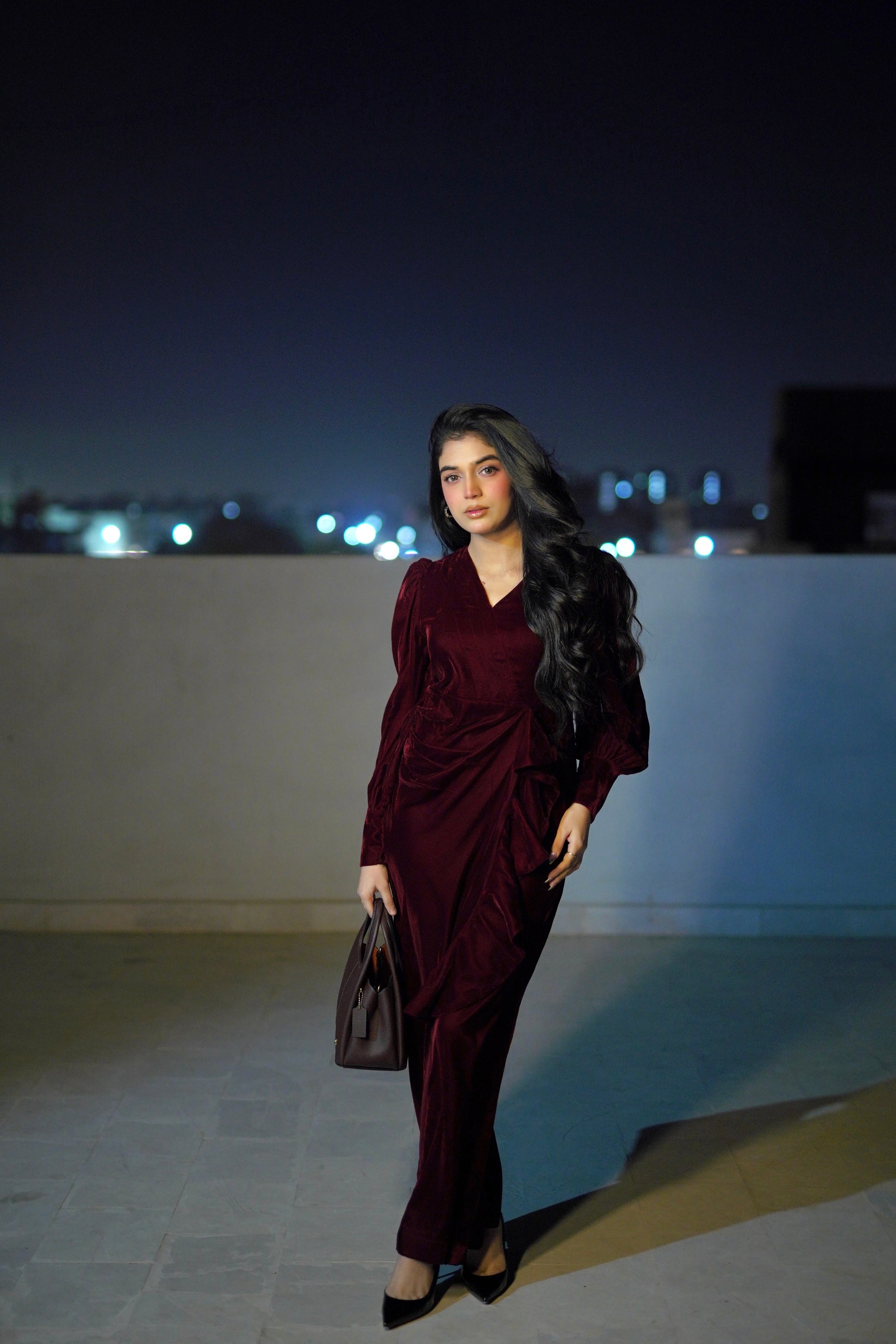 The Twilight Veil Dress is crafted from deep maroon velvet, radiating elegance and depth. With its rich, plush fabric and graceful design, this dress makes a sophisticated statement, perfect for special occasions, evening gatherings, or formal events where timeless style and refined charm are essential.