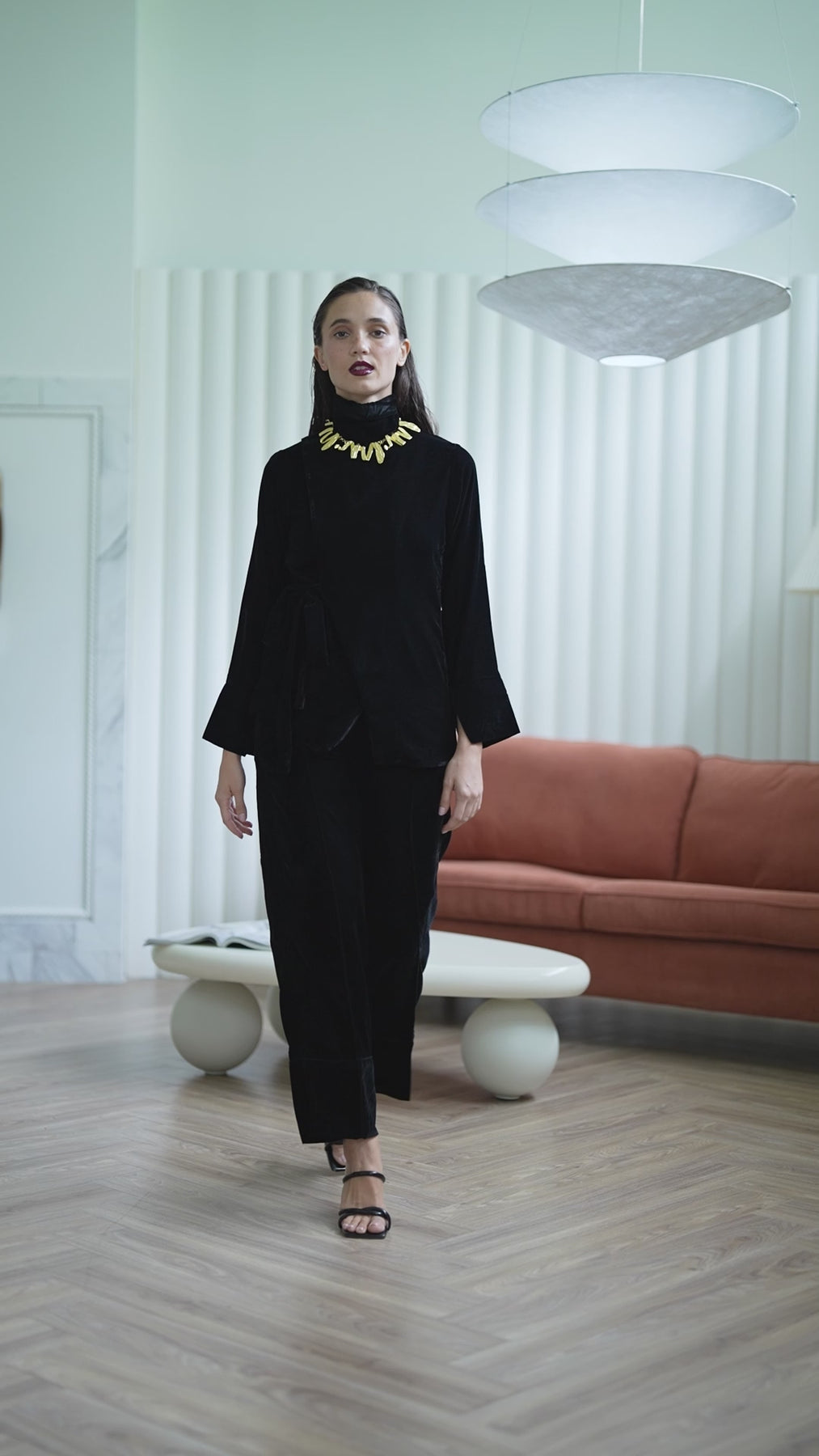 The Midnight Luxe Co-Ord Set pairs rich black velvet with a sleek, tailored design to embody understated elegance. With its luxurious texture and harmonious fit, this two-piece ensemble delivers sophistication and refinement, making it the perfect choice for formal occasions, evening gatherings, or chic events.
